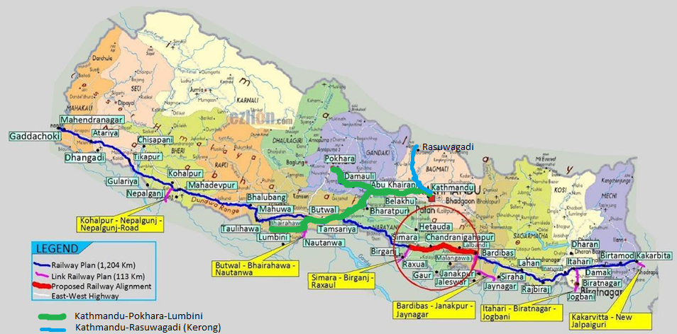 For the promotion of international trade and tourism, railway connection with China and India must be our top priority. To make the EastWest railway line feasible, it should be linked to Kathmandu. The capital city has a dense population. Other important railway networks that Nepal require are Kerung-Kathmandu and KathmanduRaxaul. Raxaul to Kathmandu route will be around 140 km and Kathmandu to Kerung will be around 150 km. China will be completing the construction of 540 km railway line from Sigatse to Kerung by 2025. Raswagadhi is only 24 km from Kerung.